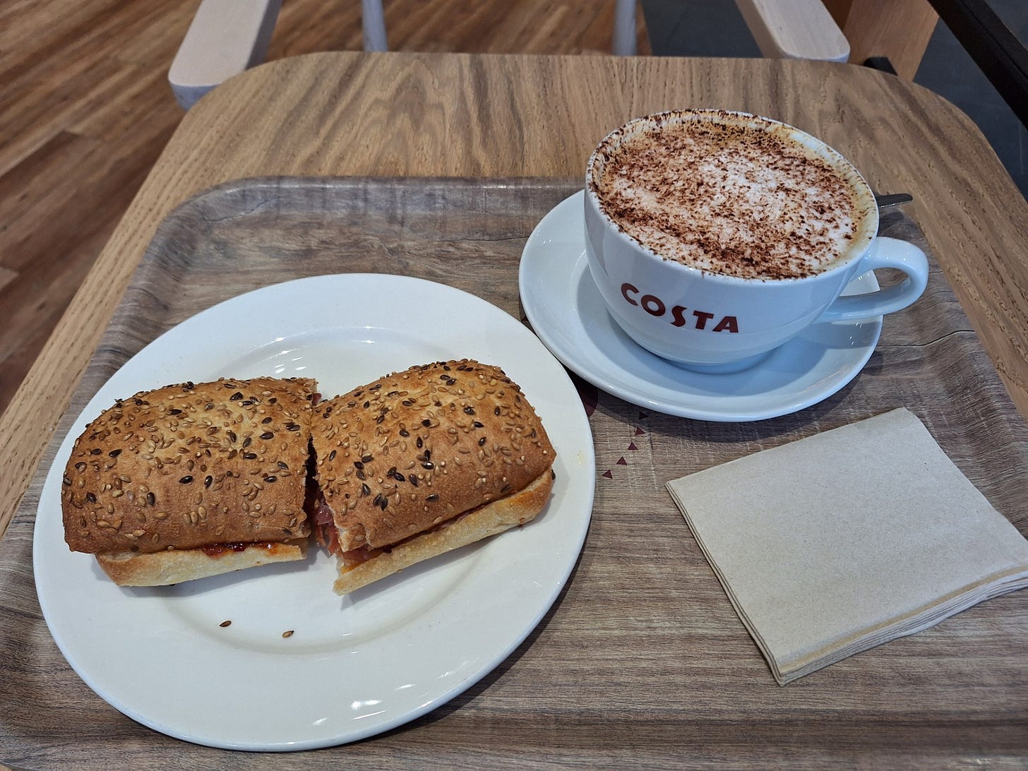 Fast forward a little and I found myself wobbly-kneed post leg day and in need of some grub and a good coffee. I’m not sure if Costa exists outside of the UK but essentially? What you’re looking at is British Starbucks except the coffee is better, the variety is more narrow and the food is slightly worse; I’m not a snob, so I order it anyway.