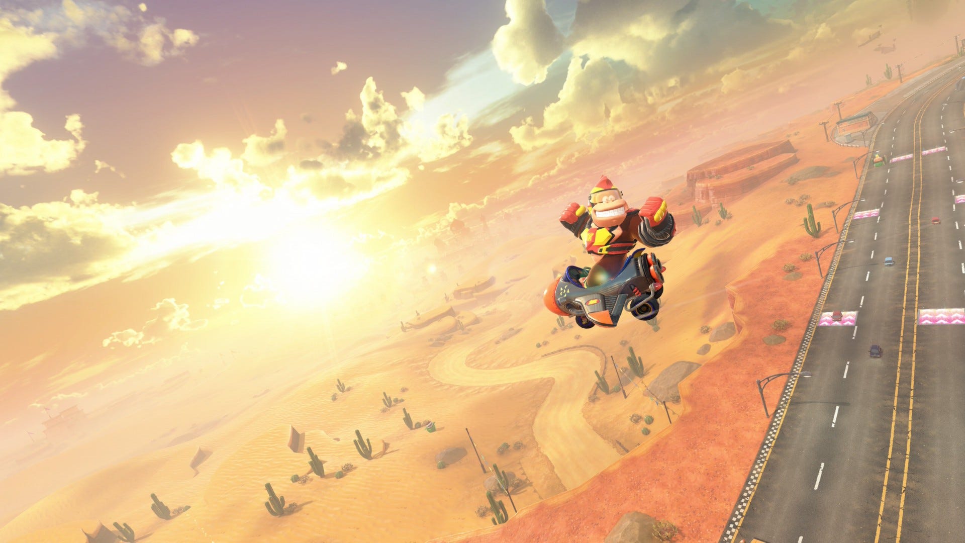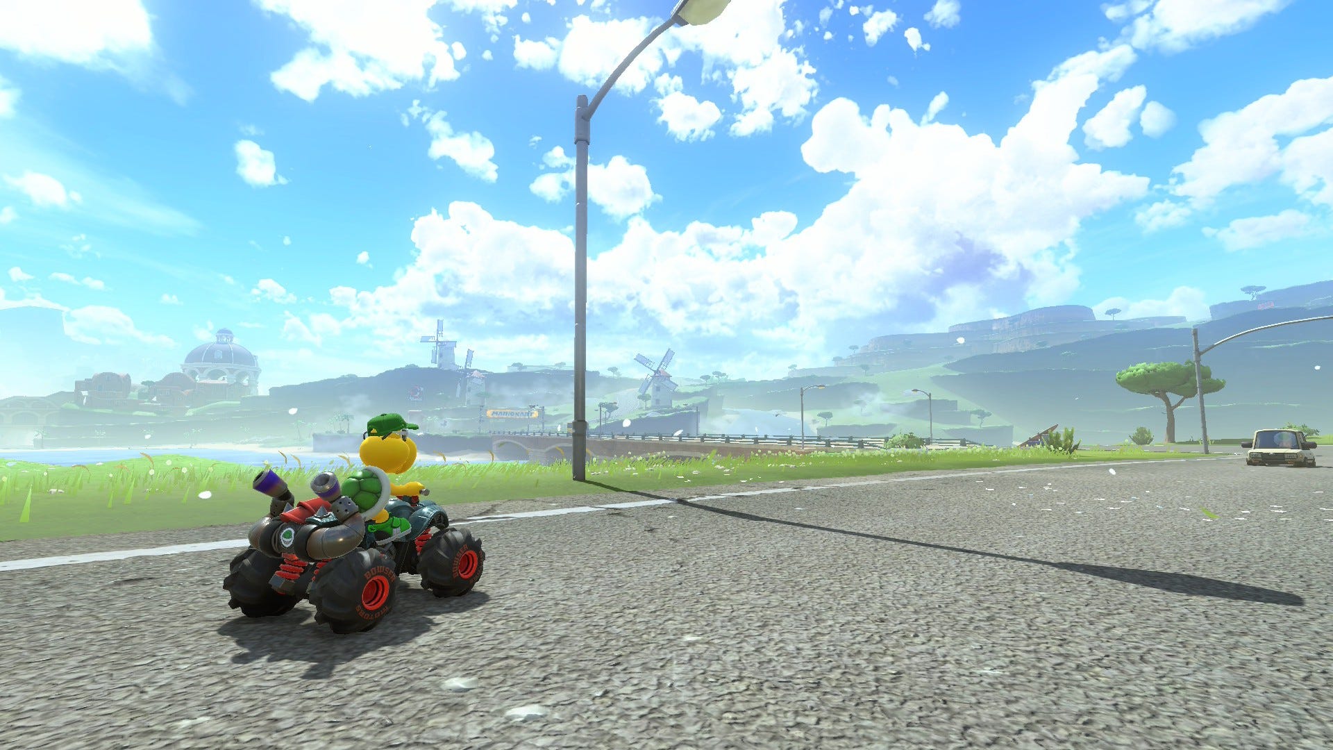 There was a moment in one of my races where, after a long and intense drive, me and the closely-packed rest of the top 5 rounded a corner at high speed onto a dusty old course with rainbow barriers, Lakitu popped up with the lap counter, the music began to rise and it was an orchestral arrangement of the Mario Kart Circuit music from Super Mario Kart on the SNES and I suddenly realised this dusty old track was that same SNES classic, it put such a smile on my face to see its age acknowledged but also for the course to be given the appropriate amount of fanfare. It plays great here too, you can absolutely shred it around the corners.